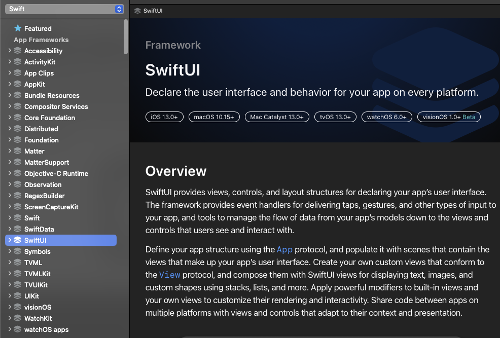 - Xcode > Windows > Developer Documentation (shift + command + O)