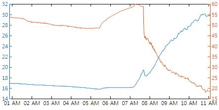 - 오전에 베란다 창문을 열어둔 이후로, 습도가 급락함. 현대 날씨 앱으로 보면 습도가 약 50%에 비해서, 더 낮음.