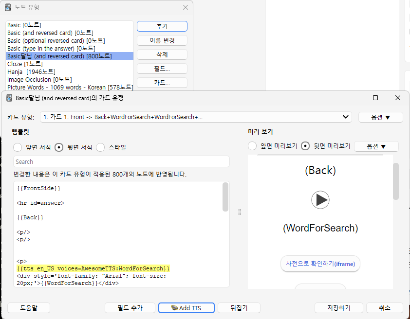 - TTS와 연동할 예정인데, 단어장에서 복수단어가 입력될 때 검색단어를 구분하기 위해서 노트 유형을 추가하고, 필드를 추가한다.