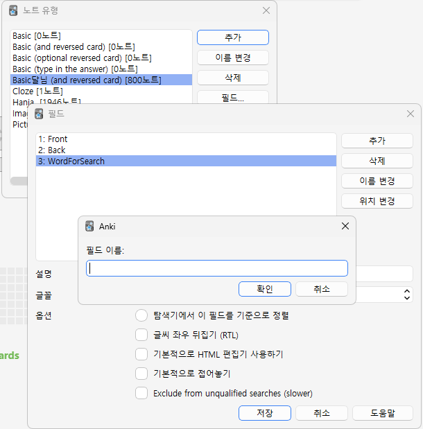 - 만약, 추가 필드나 학습 카드가 필요하다면 노트유형을 추가한다.