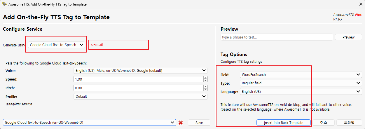 7) 그리고, [Insert into Back Template] 버튼을 선택하면, 아래와 같이 TTS 테그가 추가된다.