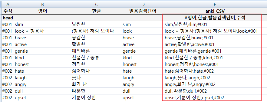 3) 단어장 작성 후 엑셀 3행부터 E열을 복사해서 csv파일을 만든다.