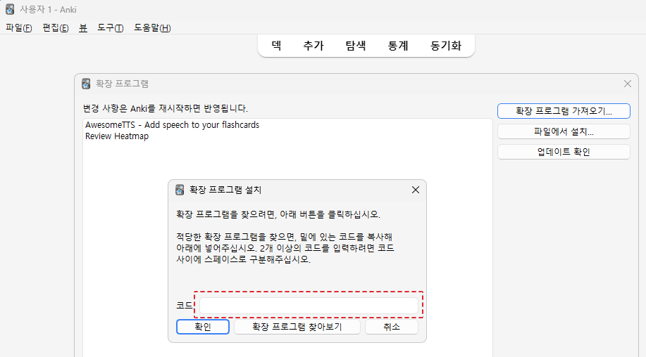 [확장 프로그램 가져오기...] 버튼을 선택해서, 팝업에 코드를 등록해서 아래 확장 프로그램을 설치한다.
