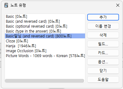 - 만약, 추가 필드나 학습 카드가 필요하다면 노트유형을 추가한다.