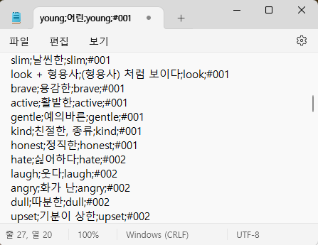 2) 기본 CSV 구분자가 콤마(",")라서 단어의 한글은 ","를 사용하지 않았다. 기본 구분자는 ";" -> ","으로 순으로 처리한다.